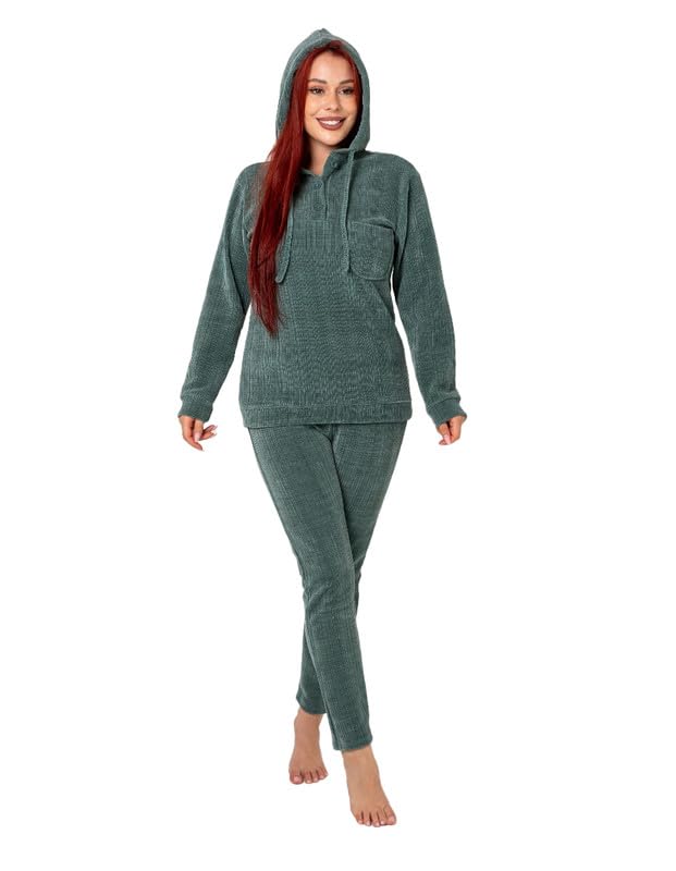 TN - تي ان طقم بيجامة قطيفة عصري للنساء - بلوزة بغطاء راس واكمام طويلة وبنطلون مقاس M - اخضر غامق - بيجامة شتوية