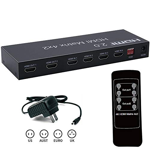 - تستطيع مصفوفة HDMI 4×2 التبديل بين 4 أجهزة مصدر إدخال وتوزيع الإشارات إلى شاشتي عرض (يمكن للشاشتين عرض الصورة نفسها أو صور مختلفة)، ويمكن لأي من منافذ الإخراج إخراج الصوت بشكل مستقل عبر منفذ الألياف البصرية أو منفذ الصوت مقاس 3.5 ملم.