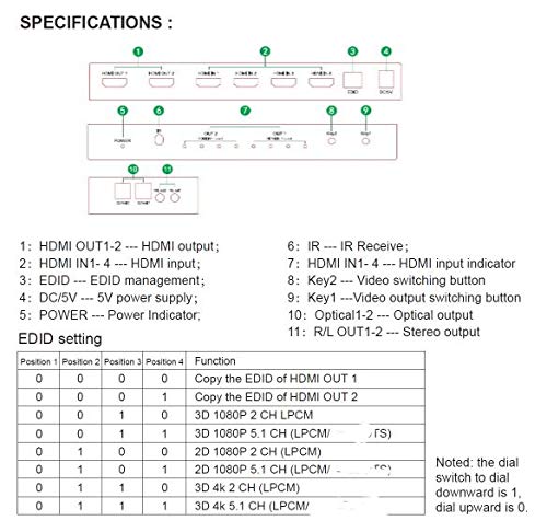 - * يدعم إخراج صوتي من منفذي HDMI ومنفذ سماعات الأذن مقاس 3.5 ملم والمخرج البصري في نفس الوقت، كما يدعم تحويل وتقسيم 4 مدخلات HDMI إلى شاشتي عرض HDMI.