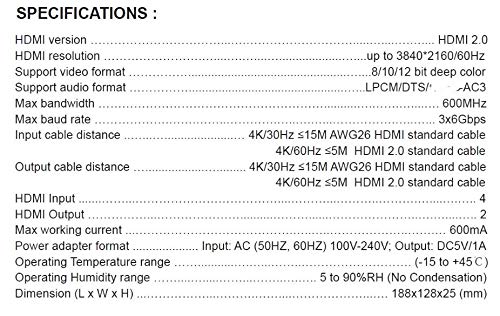 Tobo - مصفوفة توزيع HDMI 2.0 بـ 4 مداخل و2 مخرج، دقة 4K بمعدل 60Hz، محول وموزع إشارات HDMI مع خاصية EDID، دعم إخراج صوت مزدوج عبر منفذ بصري وصوتي بتقنيات HDMI 2.0 و3D و4K، دعم حماية المحتوى HDCP 2.2 من توبو