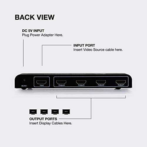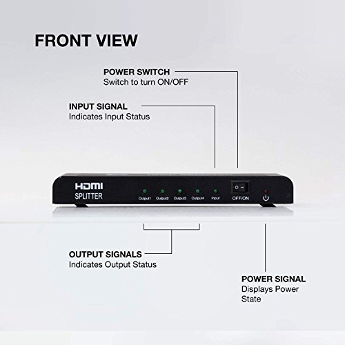 - مقسم HDMI 1 في 4 مقسم أو نسخ من إشارة أصلية واحدة إلى أربع شاشات/تلفزيون كحد أقصى مع شاشة مستقلة؛ جميع أجهزة الإخراج لا تعمل في نفس الوقت