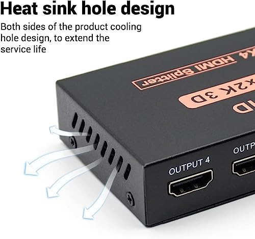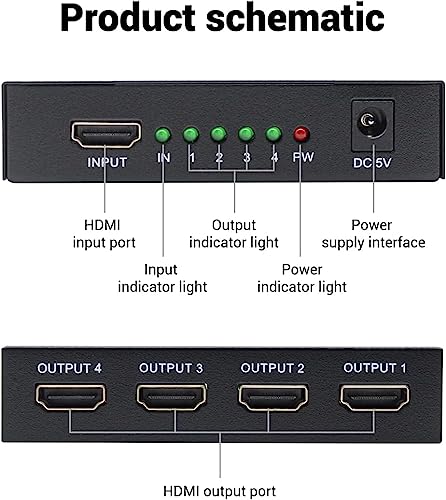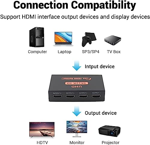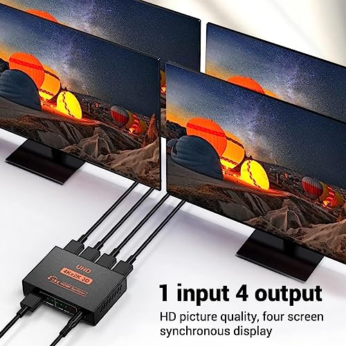 - سهل الاستخدام: مدخل واحد و4 مخرجات للتوصيل والتشغيل، لا حاجة إلى مشغل خارجي، آمن وصديق للبيئة. تحتاج فقط إلى توصيل كابل اتش دي ام اي بدقة 4 كيه بأجهزتك للاستمتاع بأفلامك أو ألعابك