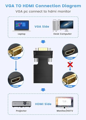 - غير ثنائي الاتجاه: فقط من VGA إلى HDMI، قم بتوصيل أجهزة VGAI بسهولة مع شاشة متوافقة مع HDMI وجهاز عرض وتلفزيون HD عالي الدقة؛ مصممة خصيصًا لأجهزة التلفزيون المزودة بمنفذ HDMI الأنثوي