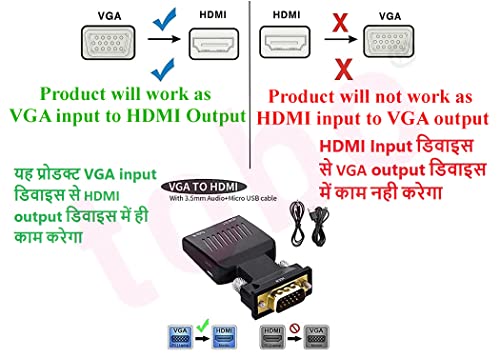 - فقط من شاشات VGA إلى HDMI (تلفزيون/شاشات). يتحول فقط من VGA (مخرج إشارة تناظرية) إلى HDMI (إشارة أنالوج). لا يمكن استخدامه ككابل محول HDMI إلى VGA.