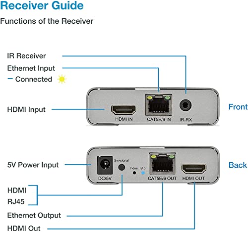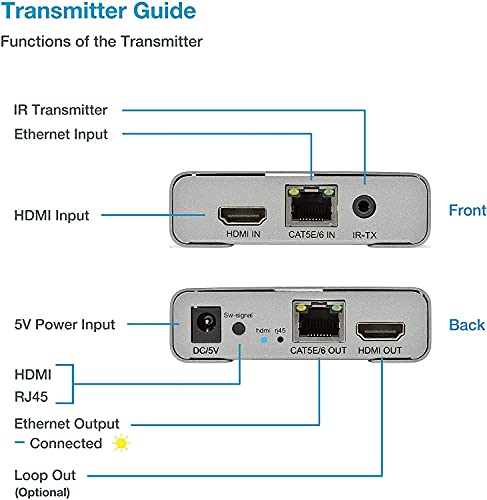 - ➤ مخرج الحلقة في نفس موقع الجهاز: يتيح إضافة شاشة أخرى على جهة الإرسال لتسهيل المراقبة، مع التحكم عن بعد بالأشعة تحت الحمراء - تحكم في مصدر فيديو HDMI المدخل (على سبيل المثال: مشغل أقراص DVD)، من الشاشة (على سبيل المثال التلفزيون والشاشة) من الموقع باستخدام كابلات مستشعر الأشعة تحت الحمراء المرفقة؛ التوصيل المتسلسل - يتيح تمديد الإشارة من جهاز واحد إلى واحد أو من جهاز واحد إلى عدة أجهزة باستخدام وحدة استقبال إضافية.