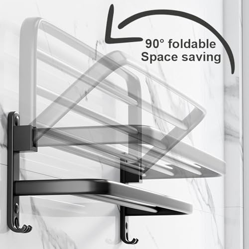 - توفير المساحة: يمكن طي رف المناشف الأنيق ومتعدد الاستخدامات على الحائط لتوفير المساحة. يمكنك طيها عندما لا تحتاج إلى استخدامها. علاوة على ذلك، يأتي حامل مناشف الحمام مع خطافين لتعليق مناشف الحمام وأدوات المطبخ والملابس والحقائب. اجعل حياتك أكثر تنظيمًا وراحة، مثالية للحمام والمرحاض والمطبخ وغرفة النوم والشرفة وغرفة الملابس وغرفة الغسيل وغرفة التجفيف وما إلى ذلك.