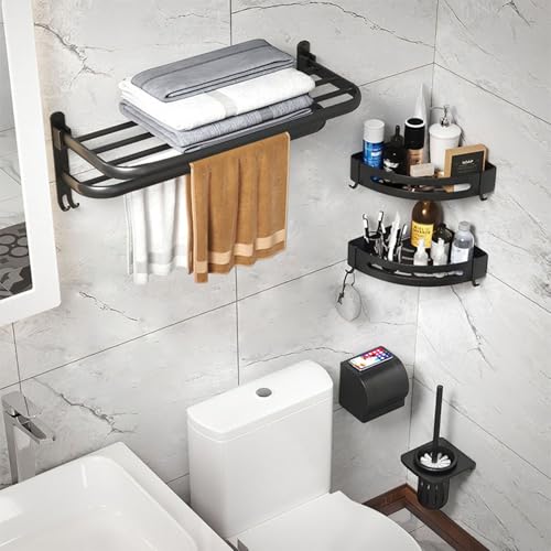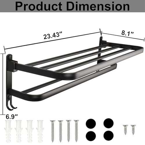 TocTen - توك تين رف مناشف للحمام، حامل مناشف قابل للطي مع قضبان مزدوجة للمناشف يثبت على الحائط من الستانلس ستيل SUS304، شماعة مناشف موفرة للمساحة للحمام والمرحاض (اسود، 24 انش)