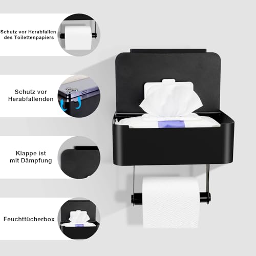 - تصميم مقاوم للسقوط: حامل ورق المرحاض يركب بسهولة بدون ثقب بثبات تام ودون أي تمايل. غطاء الصندوق مبطن ليضمن إغلاقًا هادئًا وخاليًا من الضوضاء. حامل ورق التواليت الأسود مزود بنابض بلاستيكي يمنع سقوط البكرة حتى مع السحب القوي.