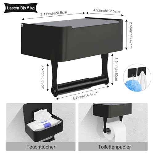 - سعة تحميل عالية: حامل بكرة المرحاض مع صندوق مناديل مبللة يوفر مساحة واسعة لهاتفك، المفاتيح، المحفظة، المناديل، الساعات، النظارات، الصابون السائل، الشموع المعطرة والمزيد. بالإضافة إلى ذلك، يتحمل حامل ورق المرحاض حتى 5 كجم بدون الحاجة للثقب، مما يمنع سقوطه ويضمن ثباته بأمان.