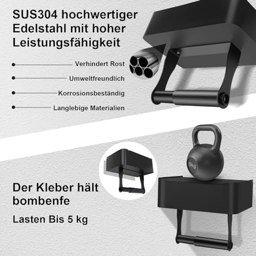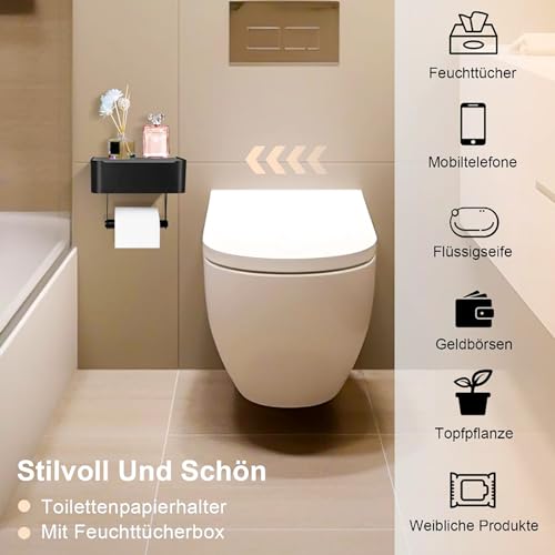 RIKBVOM - حامل ورق تواليت للمطبخ مع صندوق مناديل مبللة، بدون ثقب، مصنوع من الفولاذ المقاوم للصدأ، ذاتي اللصق غير لامع مع رف وخطافين لاصقين، أسود