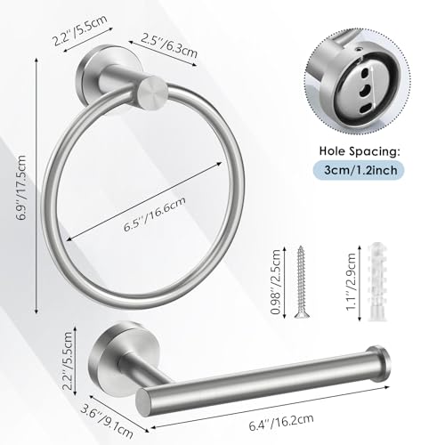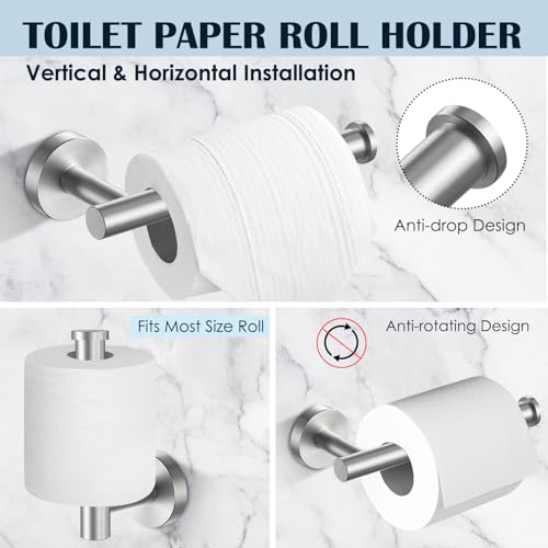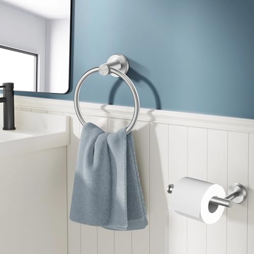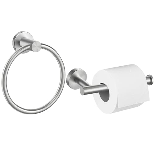ISUMER - حامل بكرة ورق التواليت وحلقة منشفة من قطعتين، مجموعة ملحقات الحمام الفضية، مجموعة ادوات الحمام من الستانلس ستيل SUS304، حامل ورق تواليت بتصميم مضاد للسقوط، حامل منشفة يد متارجح 180 درجة للحمام
