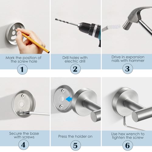 - ملحقات حمام فضية سهلة التركيب مثبتة على الحائط - مجموعة ملحقات الحمام الخاصة بنا مجهزة بالأجزاء والتعليمات اللازمة للتركيب، حتى المبتدئين يمكنهم إكمال التركيب في بضع دقائق. علاوة على ذلك، فإن التصميم المضاد للدوران لملحقات الحمام الفضية يجعل هيكلها أكثر استقرارًا وأقل عرضة للفصل وأكثر أمانًا وطمأنينة في الاستخدام.
