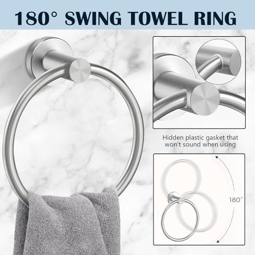 - حامل مناشف يد دوار 180 درجة - تتضمن ملحقات الحمام الفضية غير اللامعة حلقة منشفة مرنة 180 درجة يمكنك ضبطها على الزاوية المناسبة وفقًا لاحتياجاتك. يتيح لك هذا التصميم الفريد التقاط المناشف بسهولة وراحة. وهناك حشية بلاستيكية مخفية عند توصيل حامل مناشف الحمام، والتي يمكن أن تقلل الضوضاء وتجعل استخدامك أكثر راحة!