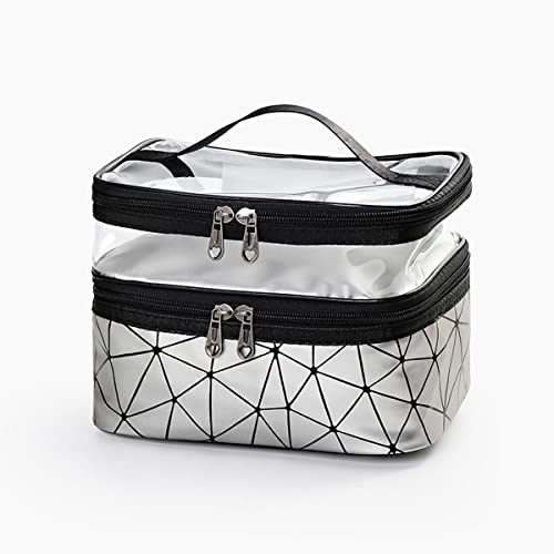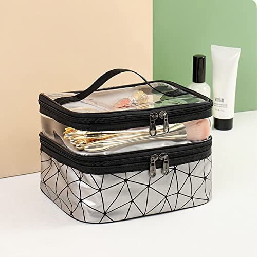 Generic - شنط أدوات الزينة للسفر مكياج شفافة مع مقبض مستحضرات تجميل مزدوجة الطبقات للنساء لمستحضرات التجميل وفرش المكياج واكسسوارات السفر فضي رمادي جلد
