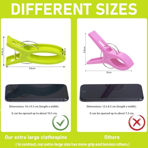 - مقاس كبير جدًا: يبلغ مقاس مشبك الفوطة هذا 16 × 9.5 سم، أقصى فتحة تصل إلى حوالي 10.5 سم، أكبر من مشابك الملابس العادية ويمكن تعليق الأشياء الثقيلة والضخمة، مصممة للأشياء الكبيرة.