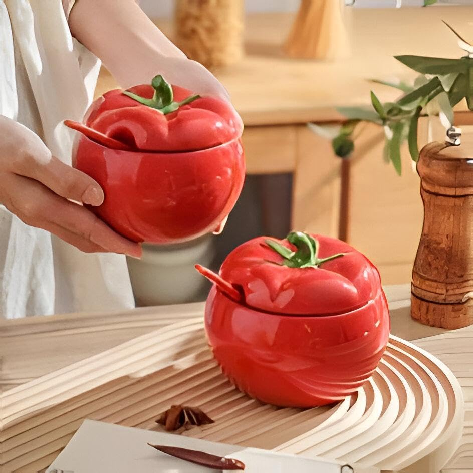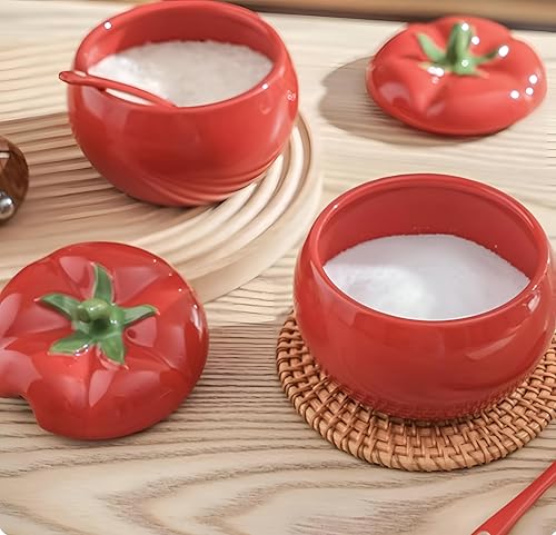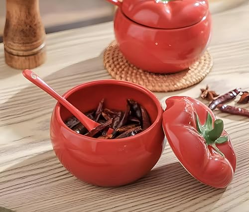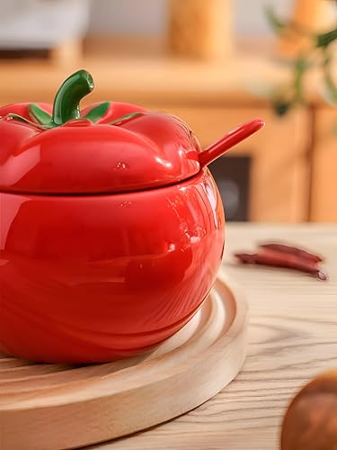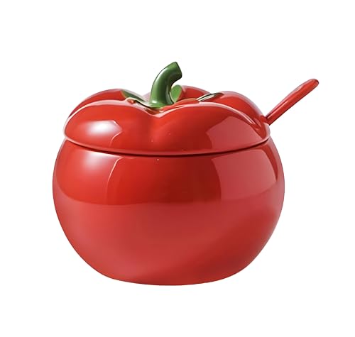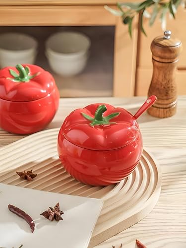 Generic - وعاء سكر طماطم - وعاء سكر بورسلين مصنوع يدويًا على شكل طماطم حمراء، يتضمن غطاء مطابق، ملعقة أنيقة، برطمان تخزين مزخرف، مثالي لأساسيات المطبخ والعرض الرشيق.