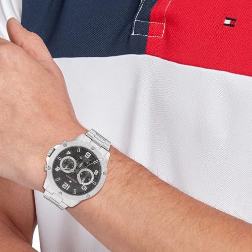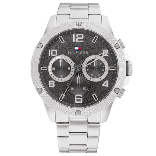 Tommy Hilfiger - ساعة كوارتز أنالوج متعددة الوظائف بسوار فضي من الفولاذ المقاوم للصدأ 1792029 من تومي هيليفيجر، لون رمادي