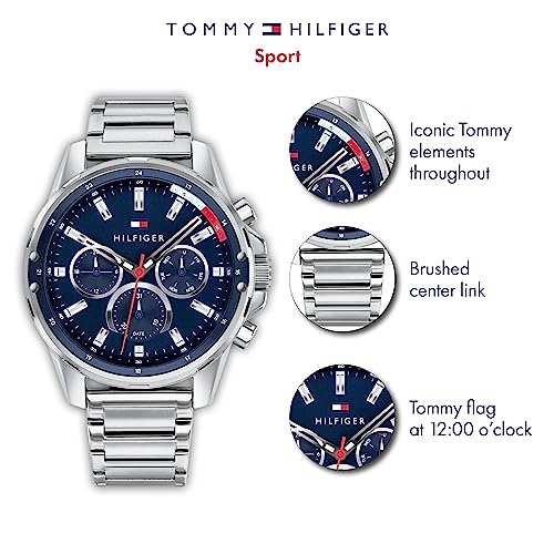 Tommy Hilfiger - ساعة كوارتز مع سوار من الستانلس ستيل للرجال تومي هيلفيجر، باللون الفضي، 21 (موديل: 1791788)، بمينا أزرق