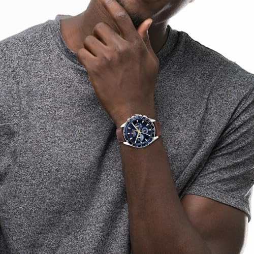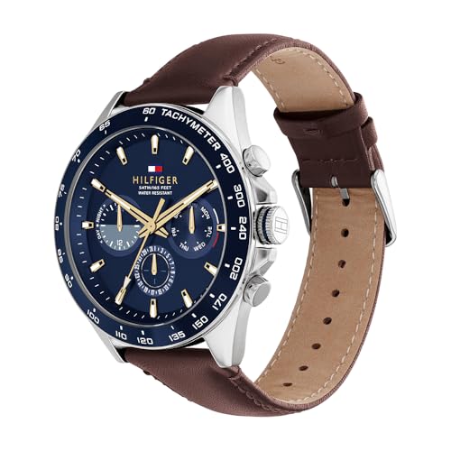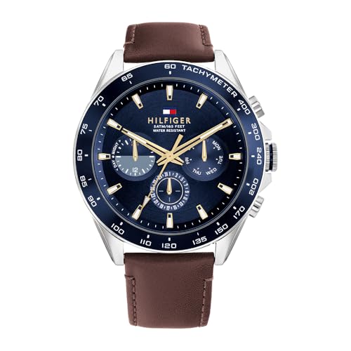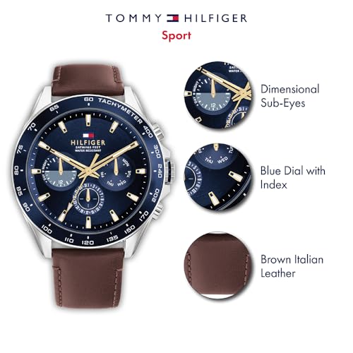 Tommy Hilfiger - تومي هيليفيغر ساعة كوارتز انالوج بعقارب وسوار جلدي للرجال من تي اتش دبليو موديل 1791965 بمينا أزرق بسوار بني
