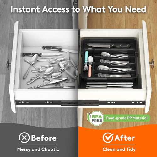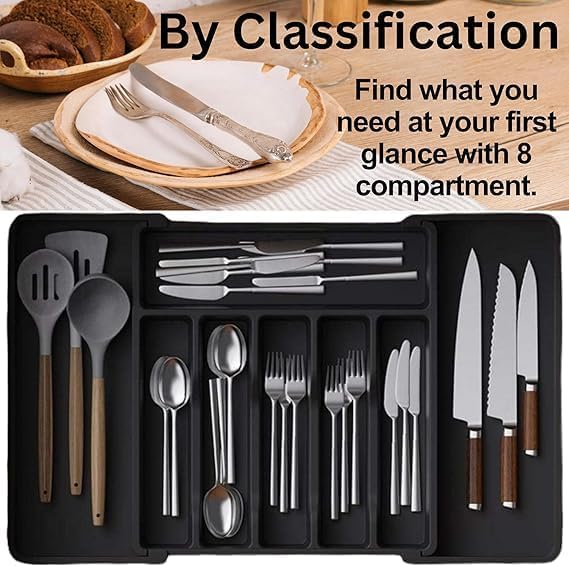 - صينية أدوات المائدة القابلة للتوسيع هذه مناسبة لمجموعة متنوعة من أدراج المطبخ. يسمح تصميمها القابل للتعديل بالتكيف مع الأدراج من جميع الأحجام. سواء كان مطبخًا مدمجًا أو مطبخًا واسعًا، يمكنك العثور على المكان المناسب لتخزين أدوات المائدة، وتحقيق استخدام معقول لمساحة المطبخ وجعل مطبخك أكثر أناقة وجمالاً.