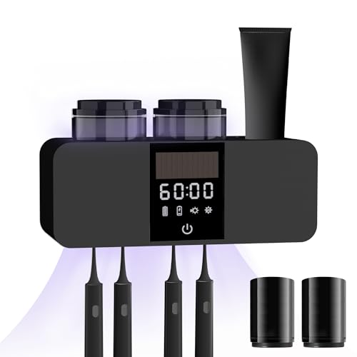 Stageya - منظف فرشاة الاسنان وحامل فرشاة الاسنان يثبت على الحائط، شاشة LED ذكية للتنظيف والتجفيف بالهواء ووظيفة المؤقت، حامل فرشاة اسنان لاسلكي قابل لاعادة الشحن للحمامات (اسود)