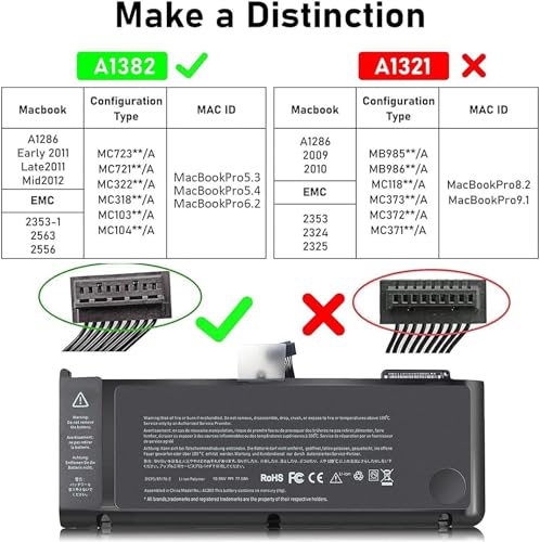 - البطارية المتوافقة: A1382 A1286 (EMC 2563/EMC 2353-1/EMC 2556), 661-5211,661-5476, MacBook Pro 15"(Early 2011-Late 2011, Mid 2012), MacBook Pro 15" (M) معرف 2012 ) ماك بوك؛ برو 8.2 ماك. بوك برو 9.1، MD322XX/A، MD318XX/A، MD035XX/A، MC723XX/A، MC721XX/A، MD546XX/A، MD104XX/A، MD103XX/A.