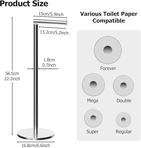 - موفر للمساحة - حامل ورق التواليت القائم بذاته مع مساحة لحمل 4 إلى 5 لفات كبيرة إضافية على الأقل. وهي متوافقة مع اللفائف العادية والبكرات الكبيرة والبكرات الكبيرة ومعظم العلامات التجارية للبكرات الضخمة.