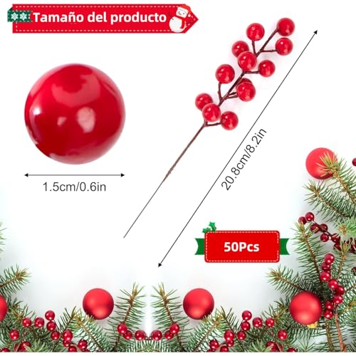TOPTHEROAD - سيقان توت أحمر صناعي لتزيين الكريسماس، كرز صناعي لتزيين شجرة الكريسماس، زينة اكليل من توب ثيرواد، 23 سم، 50 قطعة
