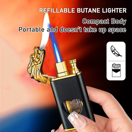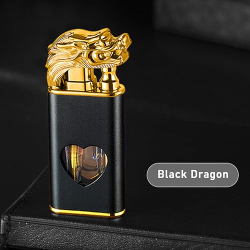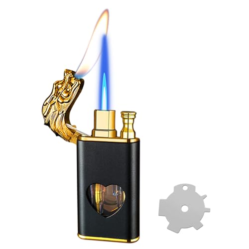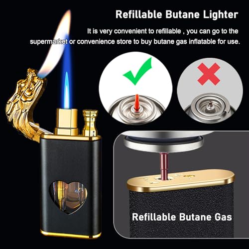 YANGVVIA - ولاعة شعلة، ولاعة تنين مزدوجة لتخفيف اللهب، ولاعة غاز مقاومة للرياح مع نافذة وقود شفافة على شكل قلب، ولاعة شمعة بشعلة نفاثة باردة، ولاعة بوتان قابلة لاعادة الملء للاستخدام الداخلي والخارجي (لوف)