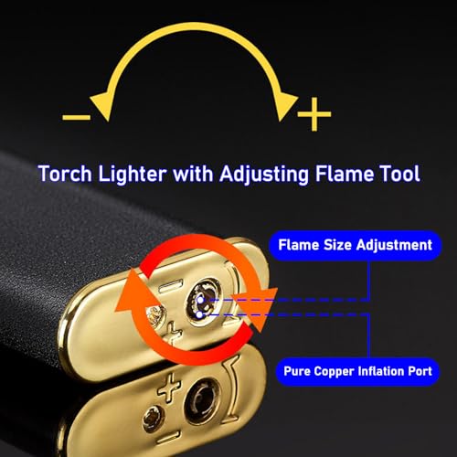 - 【حجم لهب سهل التعديل】تحتوي ولاعة الشعلة هذه على عجلة تعديل في الأسفل، وتحتوي العبوة على أداة تعديل اللهب. يمكنك بسهولة تدوير عجلة التعديل لضبط ارتفاع اللهب. إذا كان الصمام كبيرًا جدًا أو صغيرًا جدًا، فلن يؤدي ذلك إلى إشعال اللهب. إذا قمت بملء الولاعة بالبوتان وفشل الإشعال، يمكنك محاولة ضبط الصمام للعثور على نقطة إشعال مناسبة، ثم ستعمل الولاعة بشكل طبيعي.