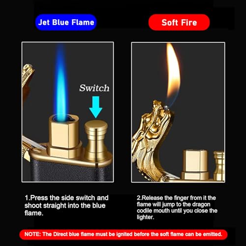 - 【وضعان للهب السحري】بعد الضغط على الزر لتشغيل النار وتحرير الإصبع منه، سيقفز اللهب إلى التنين على الفم حتى تغلق الولاعة. مقاوم للرياح ومقاوم للماء والنار الأزرق النفاث المباشر واللهب المكشوف بإجمالي وضعين للهب.