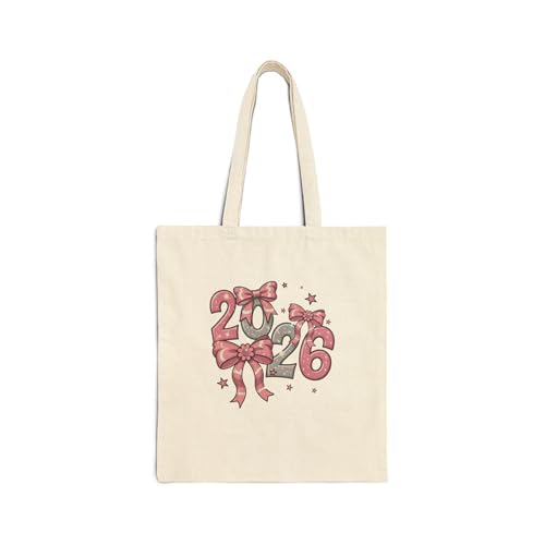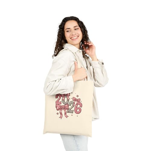 Generic - Tote Bag - حقيبة قماشية بسوسته بتصميم 2026 مع فيونكات وردية ونجوم - شنطة كتف قطنية أنيقة بستايل "كوكيت" لهدايا رأس السنة، أبيض كريمي متين.