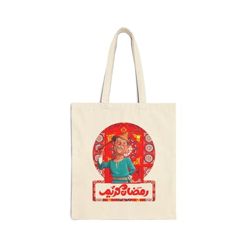 Generic - Tote Bag - حقيبة قماشية بسوسته بتصميم شخصية المسحراتي على خلفية خيامية حمراء بعبارة "رمضان كريم" - شنطة كتف قطنية أصيلة لهدايا رمضان، أبيض كريمي متين.