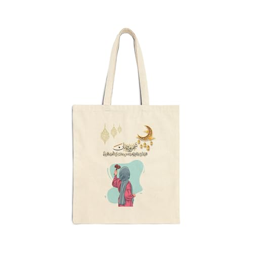 Generic - Tote Bag - حقيبة قماشية بسوسته بتصميم فني لفتاة تحمل وردة تحت هلال ذهبي وآية "شهر رمضان" - شنطة كتف قطنية راقية لهدايا رمضان، أبيض كريمي متين.