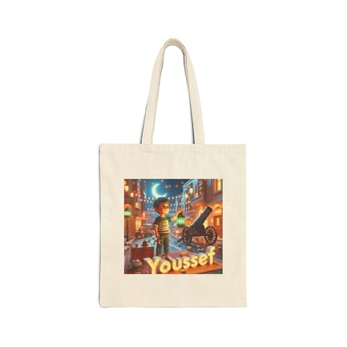 Generic - Tote Bag - حقيبة قماشية بسوسته بتصميم طفل يحمل فانوساً بجوار مدفع رمضان باسم "يوسف" - شنطة كتف قطنية مبهجة لهدايا الأطفال، أبيض كريمي متين.