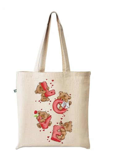 Generic - شنطة توت، بيج، حروف حب مع تصميم دببة تيدي، موضوع قلوب