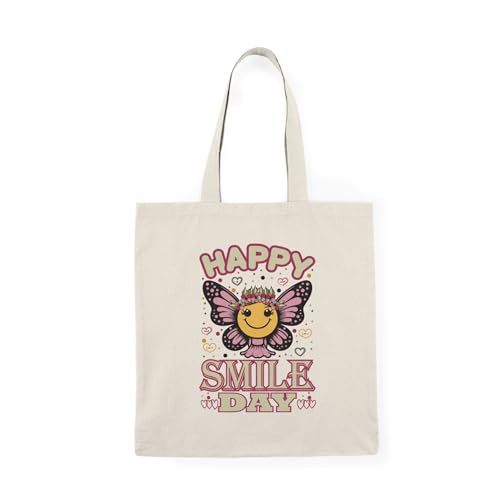 Generic - شنطة يد كبيرة توت - شنطة قماشية بسحاب - ابتسامة فراشة - هابي سمايل داي - شنطة تسوق مطبوعة - خفيفة ومتينة وصديقة للبيئة - شنطة هدايا للكلية