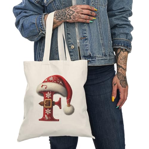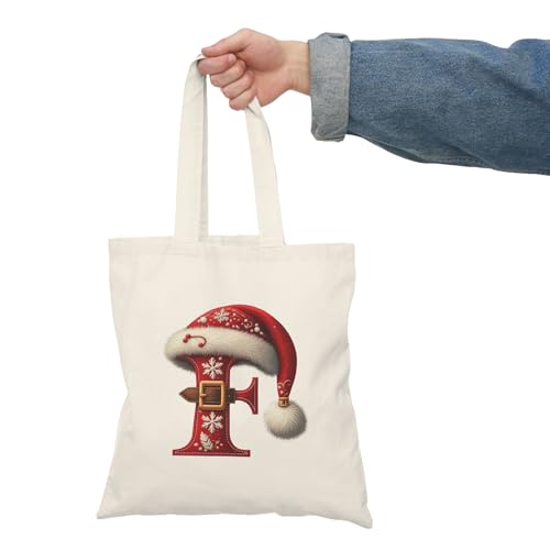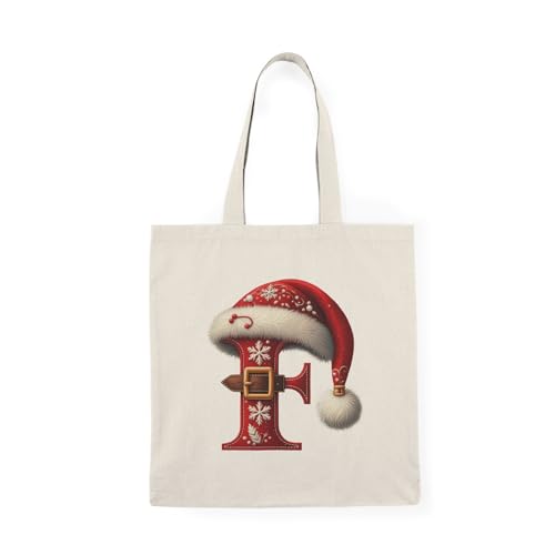 Generic - Tote Bag - شنطة قماش بسوستة – بحرف F بتصميم كريسماس – حرف F مزين بقبعة سانتا وحزام عيد الميلاد – شنطة خروج وتسوق مطبوعة – خفيفة ومتينة وصديقة للبيئة مناسبة للهدايا والجامعة