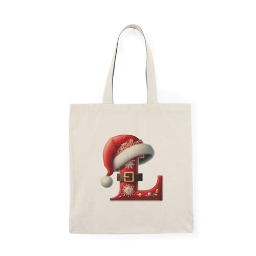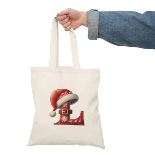 Generic - Tote Bag - شنطة قماش بسوستة – بحرف L بتصميم كريسماس – حرف L مزين بقبعة سانتا وحزام عيد الميلاد – شنطة خروج وتسوق مطبوعة – خفيفة ومتينة وصديقة للبيئة مناسبة للهدايا والجامعة