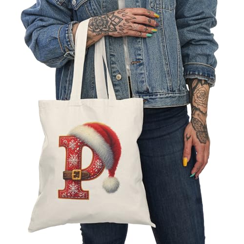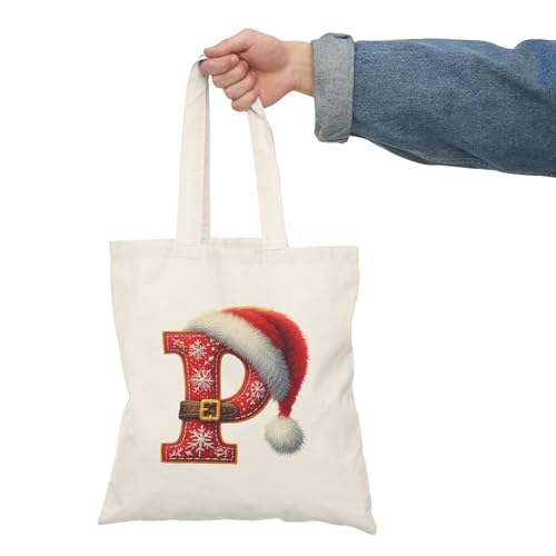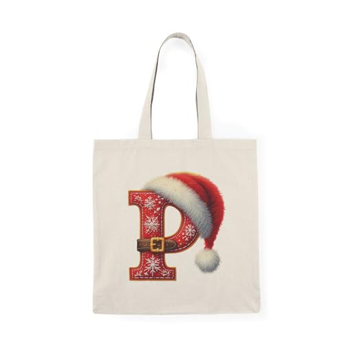 Generic - Tote Bag - شنطة قماش بسوستة – بحرف P بتصميم كريسماس – حرف P مزين بقبعة سانتا وحزام عيد الميلاد – شنطة خروج وتسوق مطبوعة – خفيفة ومتينة وصديقة للبيئة مناسبة للهدايا والجامعة