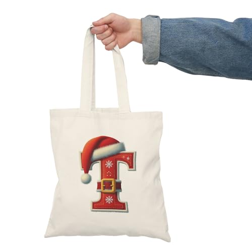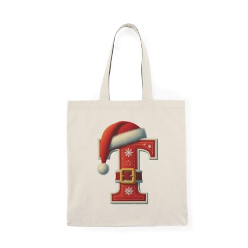 Generic - Tote Bag - شنطة قماش بسوستة – بحرف T بتصميم كريسماس – حرف T مزين بقبعة سانتا وحزام عيد الميلاد – شنطة خروج وتسوق مطبوعة – خفيفة ومتينة وصديقة للبيئة مناسبة للهدايا والجامعة