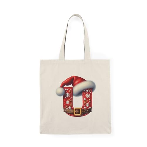 Generic - Tote Bag - شنطة قماش بسوستة – بحرف U بتصميم كريسماس – حرف U مزين بقبعة سانتا وحزام عيد الميلاد – شنطة خروج وتسوق مطبوعة – خفيفة ومتينة وصديقة للبيئة مناسبة للهدايا والجامعة