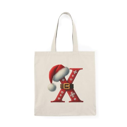 Generic - Tote Bag - شنطة قماش بسوستة – بحرف X بتصميم كريسماس – حرف X مزين بقبعة سانتا وحزام عيد الميلاد – شنطة خروج وتسوق مطبوعة – خفيفة ومتينة وصديقة للبيئة مناسبة للهدايا والجامعة