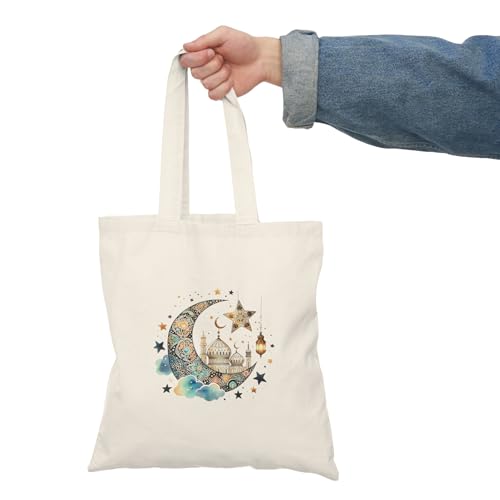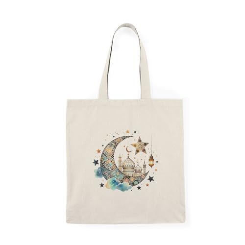 Generic - Tote Bag - شنطة قماش بسوستة – تصميم الهلال والمسجد مع النجوم الملونة تصميم لشهر رمضان الكريم – شنطة خروج وتسوق مطبوعة – خفيفة ومتينة وصديقة للبيئة مناسبة للهدايا والجامعة