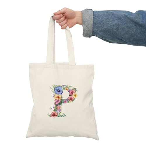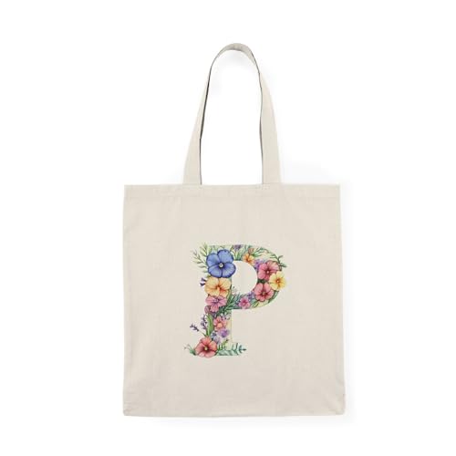 Generic - Tote Bag - شنطة قماش بسوستة – تصميم حرف P مزين بالورود والأزهار – شنطة خروج وتسوق مطبوعة – خفيفة ومتينة وصديقة للبيئة مناسبة للهدايا والجامعة