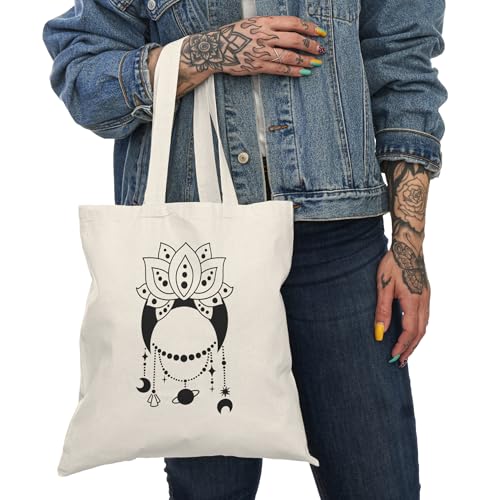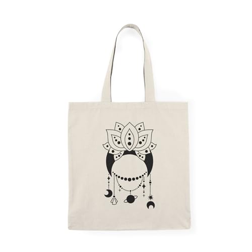 Generic - Tote Bag - شنطة قماش بسوستة – تصميم زهرة اللوتس والرموز الكونية والهلال – شنطة خروج وتسوق مطبوعة – خفيفة ومتينة وصديقة للبيئة مناسبة للهدايا والجامعة