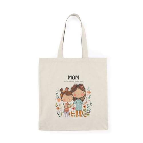 Generic - Tote Bag – شنطة قماش بسحاب - تصميم "أمي.. حبي الأول وصديقتي الأبدية" - رسم توضيحي فني للأم والطفلة - شنطة كتف قطنية هدية للأم في عيد ميلادها وعيد الأم – حقيبة واسعة