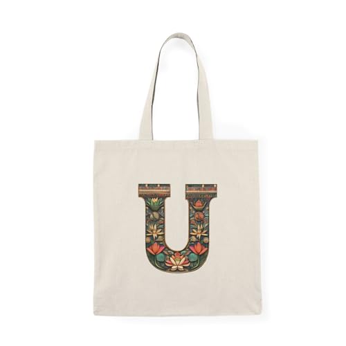 Generic - Tote Bag - شنطة قماش بسوستة – بحرف U بتصميم زهور فرعونية مستوحى من الفن المصري القديم – شنطة خروج وتسوق مطبوعة – خفيفة ومتينة وصديقة للبيئة مناسبة للهدايا والجامعة