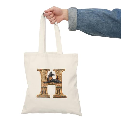 Generic - Tote Bag - شنطة قماش بسوستة – بحرف H بتصميم فرعوني مزخرف وتمثال أنوبيس داخل الحرف – شنطة خروج وتسوق مطبوعة – خفيفة ومتينة وصديقة للبيئة مناسبة للهدايا والجامعة