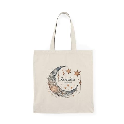 Generic - Tote Bag - شنطة قماش بسوستة – تصميم رمضان مبارك مع هلال مزخرف باللون الذهبي – شنطة خروج وتسوق مطبوعة – خفيفة ومتينة وصديقة للبيئة مناسبة للهدايا والجامعة
